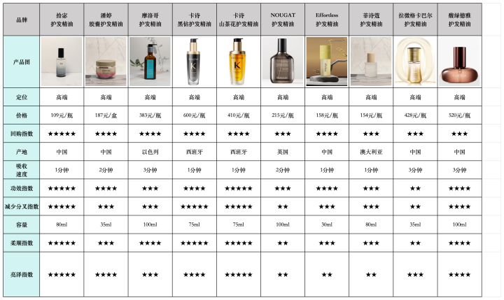 (拾宓护发精油与其他产物的测评数据对比,以便专家能够对它们有一个基本的了解)