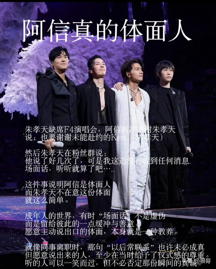 手脚这次换角的中枢东谈主物之一,阿信的恢复显得相配和睦克制。在研讨应酬平台的发言中,他并未顺利说起朱孝天的名字,也莫得对换角事件本人进行过多辩解,反而珍惜强调了我方与F4成员多年来的脸色。